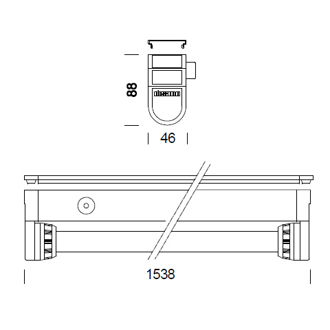 Corpo apparecchio: In acciaio laminato zincato, preverniciato a forno con resina poliestere, stabilizzata ai raggi UV, con bordi risvoltati antitaglio e con testate in policarbonato. Cablaggio: Alimentazione 230V/50Hz con reattore tipo T45. Cavetto rigido sezione 0.50 mm2 , guaina di PVC-HT resistente a 90°C secondo le norme CEI 20-20. Morsettiera 2P+T con massima sezione dei conduttori ammessa 2.5 mm2 . Dotazione: Nottolini di fissaggio in nylon. FL 1x58W G13. Bianco.