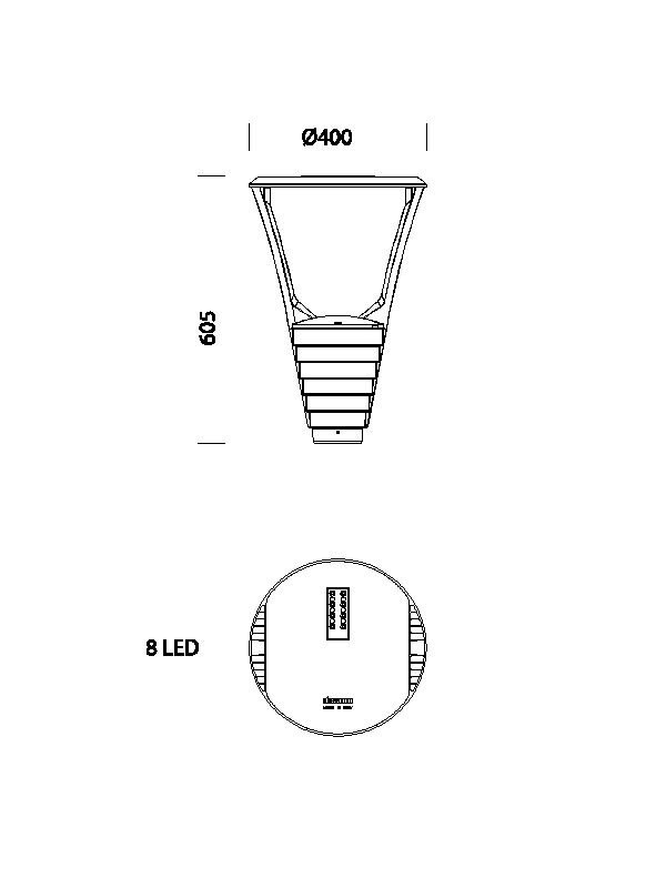 Corpo e bracci : in alluminio pressofuso, disegnati con una sezione a bassissima superficie di esposizione al vento. Ottiche: ottiche realizzate in PMMA con alta resistenza alla temperatura e ai raggi UV. Attacco palo: in alluminio pressofuso. Idoneo per pali di diametro da 60 a 67mm. Diffusore: vetro trasparente sp. 4mm temperato resistente agli shock termici e agli urti (UNI-EN 12150-1 : 2001). Verniciatura: in diverse fasi. Ad immersione per cataforesi epossidica grigia per la resistenza alla corrosione e alle nebbie saline. Seconda mano di finitura con resina acrilica, ecologica, stabilizzata ai raggi UV. Dotazione: cablaggio posto su piastra di cablaggio in nylon 30% f.v. con connettori rapidi per il collegamento della linea e del LED. Dispositivo di controllo della temperatura all’interno dell’apparecchio con rispristino automatico. Con dispositivo elettronico dedicato alla protezione del modulo LED. Valvola anticondensa per il ricircolo dell’aria. Risparmio: la possibilità di scegliere la corrente di pilotaggio dei LED consente di disporre sempre della potenza adeguata ad una specifica condizione progettuale, semplificando anche l’approccio alle future problematiche di manutenzione ad aggiornamento. La scelta di una corrente più bassa aumenteràl’efficienza e quindi migliorerà il risparmio energetico, mentre con una corrente maggiore si otterrà più luce e sarà possibile ridurre il numero degli apparecchi. Normativa: prodotti in conformità alle norme EN60598 - CEI 34 - 21. Hanno grado di protezione secondo le norme EN60529. LED: fattore di potenza: ≥0,9 Mantenimento del flusso luminoso al 70%: 50000h (L70B50) .LED white 16W 2235lm @ 700mA-4000K-CRI 70.