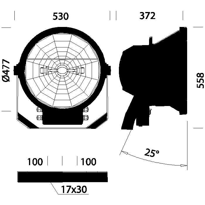 1195 Forum - XL Riaccensione a caldo - CORPO/TELAIO: In alluminio pressofuso, con alettature di raffreddamento. RIFLETTORE: In alluminio 99.98, ossidato anodicamente e brillantato con aletta di recupero del flusso luminoso. DIFFUSORE: Vetro temperato sp.5 mm resistente agli shock termici e agli urti (prove UNI EN 1250-1:2001). VERNICIATURA: a polvere poliestere colore grigio grafite resistente alla corrosione e alle nebbie saline. PORTALAMPADA: In ceramica e contatti argentati. Attacco a cavo. CABLAGGIO: Alimentazione 230V/50Hz. Cavetto flessibile capicordato con puntali in ottone stagnato, isolamento in silicone con calza in fibra di vetro, sezione 2.5 mm². Morsettiera 2P+T in nylon con massima sezione dei conduttori ammessa 6 mm². EQUIPAGGIAMENTO: Pressacavo in nylon f.v. diam. 1/2 pollice gas. Dispositivo di protezione: al momento dell'apertura (a cerniera) della parte posteriore il contatto da normalmente chiuso si apre interrompendo l'alimentazione. Con mirino per il puntamento. Valvola di ricircolo aria. Completo di accenditore posto nell'apposita cassetta in dotazione. NORMATIVA: Prodotti in conformità alle vigenti norme EN60598-1 CEI 34-21, sono protetti con il grado IP66/IK08 secondo le EN 60529. Hanno ottenuto la certificazione di conformità Europea ENEC. Superficie di esposizione al vento: L:1400cm² F:2000cm². Riaccensione a caldo: Accenditore elettronico con accensione intelligente con tecnologia a microprocessore. Riconoscimento automatico della lampada connessa con relativa regolazione della tensione di innesco. Accensione simmetrica con spegnimento automatico in caso di guasto o di fine vita della lampada per preservare i componenti dell’ apparecchio d’illuminazione. MAX-TS 2000W SA by wire. GRAFITE.