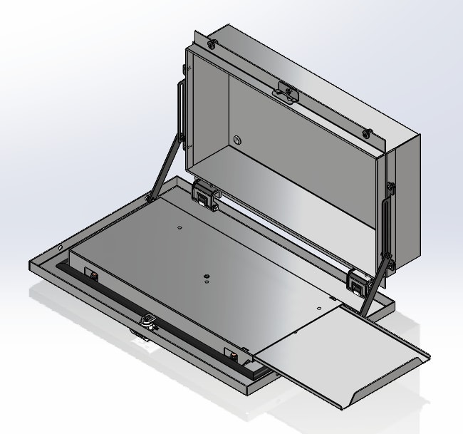 Ripiano richiudibile, montaggio su pannello. Realizzato in lamiera d'acciaio sp. 20/10 verniciato RAL 7035 bucciato. Consente di utilizzare tastiere di comando universali.