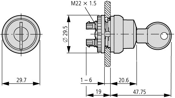 Selettore a chiave, Gamma di prodotti: RMQ-Titan, Apparecchio singolo, Progettazione: Pulsante a chiave, permanente, Non adatto per sistemi gerarchici di chiavi, 3 posizioni, I, II, Grado di protezione: IP66, Ghiera frontale Titan, Collegamento a SmartWire-DT: sì, con collegamenti SWD-RMQ, Dimensioni frontali: 29,7, Istruzioni: Funzionalità permanente/impulsivo, modificabile con M22-XC-Y, Estrazione chiave convertibile con adattatori di codifica M22-XC-..., con ponticello per azionamento del contatto centrale, Con 1 chiave, Conformità alle norme: IEC/EN 60947, VDE 0660, Grado di protezione: IP66