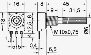 POTENZIOMETRI A STRATO Dl CARBONE A VARIAZIONE LINEARE. Completamente isolati senza interruttore. Terminali per C.S. albero in adixite Ø 6 mm. Montaggio orizzontalePOTENZA A 40°C:0,25 W. TOLLERANZA:20% fino a 470K. 30% da 1,0M a 2,2M. TEMP. LAV.:-25°C÷+70°C. ANG. MECC.:300°±5°. MANOP.:15/1000 - 15/7000. Resistenza: 100 KOHM.
