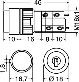 INTERRUTTORE A CHIAVE BIPOLARE 2 POSIZIONI. Fornito con 2 chiavi estraibili sia in chiusura che in apertura del contatto, unica combinazione.CORPO:term. res. alte temp. CONTATTI:argento. TERMINALI:a saldare. RESIST.ISOL.:>100 MOHM. RES. CONT.:< 50 mOHM. GRADO DI PROTEZ.:IP 40. TEMP.LAV.:-25°C ÷ +55°C. FORAT.PANN.:Ø 16 mm. SPESS.MAX PANN.:8 mm. PORTATA MAX.:5 A-250 VCA. ANGOLO ROTAZ.:90°.