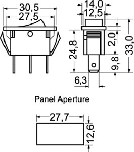 Interruttore luminoso a bilancere, corpo in abs nero, contatti in argento, fissaggio a pannello autobloccante, terminali faston passo 6,35, temperatura di esecuzione -20°C +125°C