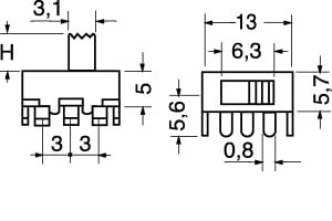 DEVIATORE MINIATURA 1 SCAMBIO 2 POSIZIONI. TERMINALI:c.s. PORTATA:0,5 A - 30 VCC.