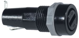PORTAFUSIBILE DA PANNELLO PER FUSIBILI 5x20. Con scritta "fuse"sul cappuccio. CORPO:termopI. autoest. CONTAT.:lega rame stagn. PORTATA:6,3 A - 250 V. PER FUSIBILI:4/9950.