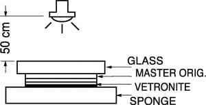 PIASTRE PRESENSIBILIZZATE. In vetronite. Ramata trattata con fotoresist positivo. Per la preparazione della piastra si procede nel modo seguente: 1) Sovrapporre l' originale sulla vetronite, come raffigurato nel disegno, quindi esporre alla luce di unalampada. Attenzione, il tempo di esposizione varia notevolmente secondo il tipo di lampada utilizzata. Per esempio le lampade di tipo U.V. hanno bisogno di un tempo di esposizione di circa 2-3 minuti, le alogene da 800 W di circa 3 minuti. 2) Preparare in un contenitore lo sviluppo 7/5690 immergendo la piastra per circa 2 minuti. Anche questo è un tempo che può variare a seconda della concentrazione di sviluppo o della tempeatura, ma essendo un fenomeno visibile, è facilmente controllabile e di conseguenza prolungabile. 3) Per l'incisione, dopo aver sciacquato a fondo con acqua corrente la piastra, immergere la stessa in un contenitore preventivamente preparato con acido 7/327 . Per diminuire i tempi di incisione è sufficiente portare la temperatura dell' acido a 30°-40°C. Il fotoresist si toglie dalle piste con qualsiasi solvente. SPESSORE RAME:35u. SPESSORE PIASTRA:1,6 mm. Dimen.: 200x300 mm. Tipo Piastra: Singola faccia.