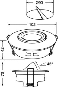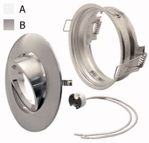 GHIERA TONDA BASCULANTE CON CONNESIONE GU5.3. Ghiera portalampada tonda professionale da incasso basculante in alluminio. Fissaggio della lampada ad incastro. Adatto per installazioni tradizionali e di design. Fornita con cavetto connessione GU5,3. Utilizzabile anche per lampade GU10 previo utilizzo del connettore 19/6992 non in dotazionePotenza max installabile: 50w. Foro incasso: 93mm. Colore: Spazzolata.