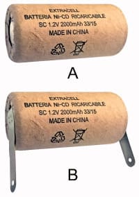 BATTERIE RICARICABILI NI-CD TIPO SC. TENSIONE:1,2 V. CAPACITA’:2000mAh. CARICABATTERIE:30/8668. Per piccoli elettrodomestici casalinghi, trapani portatili, lampade d'emergenza ed impieghi vari. Con rivestimento in cartone. Dis.: B.