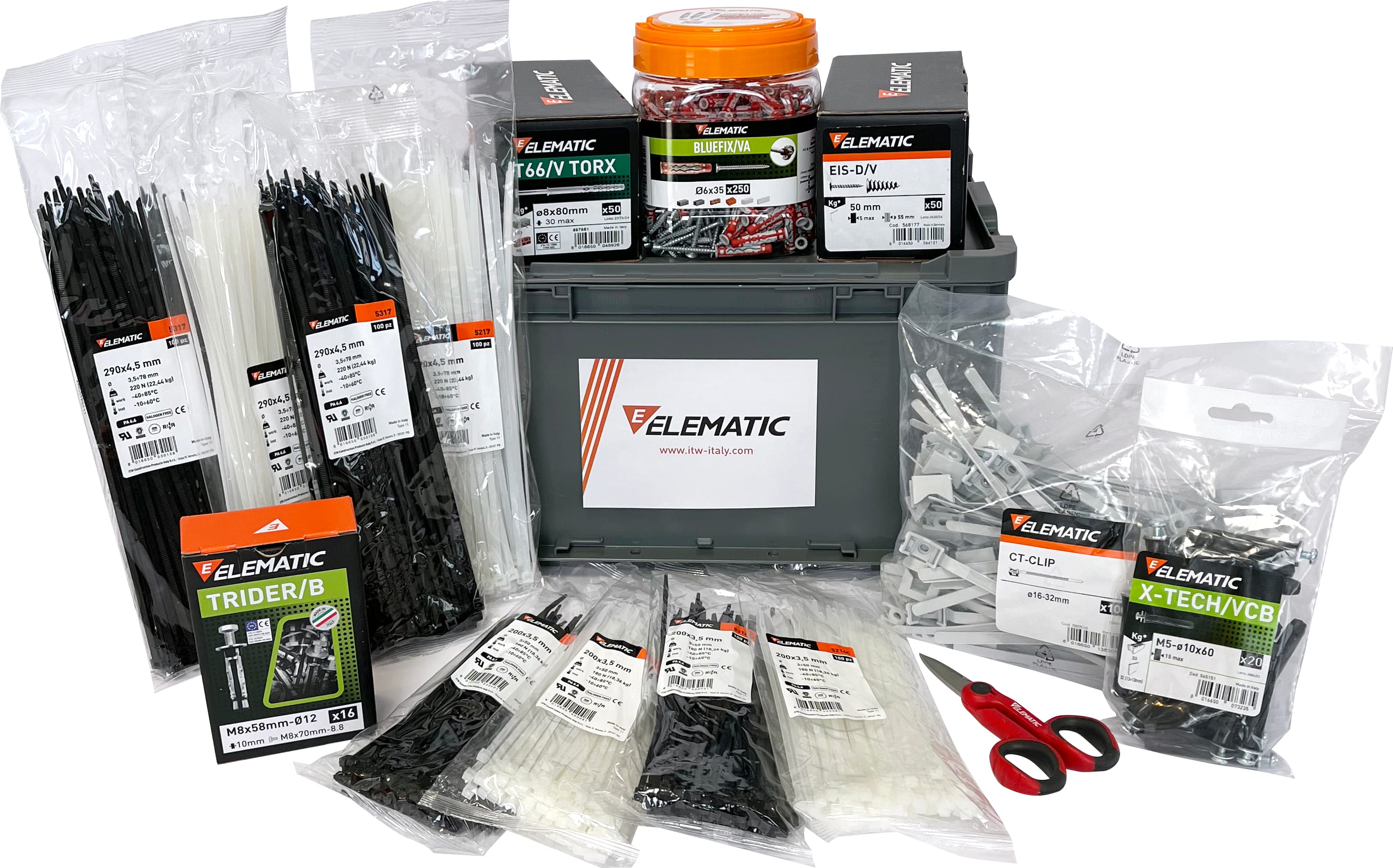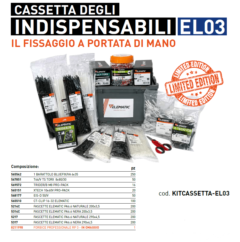 La cassetta degli indispensabili EL03 e un mix di prodotti per il fissaggio Elematic Spit pensati esclusivamente per l'elettricista. All'interno troverai:565542 1 BARATTOLO BLUEFIX/VA 6x35 (250 pz)567851 T66/V TS TORX 8x80/30 (50 pz)569572 TRIDER/B M8 PRO-PACK (16 pz)565151 XTECH 10x60V PRO-PACK (20 pz)568177 EIS-D 50/V (50 pz)565510 CT-CLIP 16-32 ELEMATIC (100 pz)5214C FASCETTE ELEMATIC PA6.6 NATURALE 200x3,5 (200 pz)5314C FASCETTE ELEMATIC PA6.6 NERA 200x3,5 (200 pz)5217 FASCETTE ELEMATIC PA6.6 NATURALE 290x4,5 (200 pz)5317 FASCETTE ELEMATIC PA6.6 NERA 290x4,5 (200 pz)8211998 FORBICE PROFESSIONALE RP 3 - IN OMAGGIO (1 pz)
