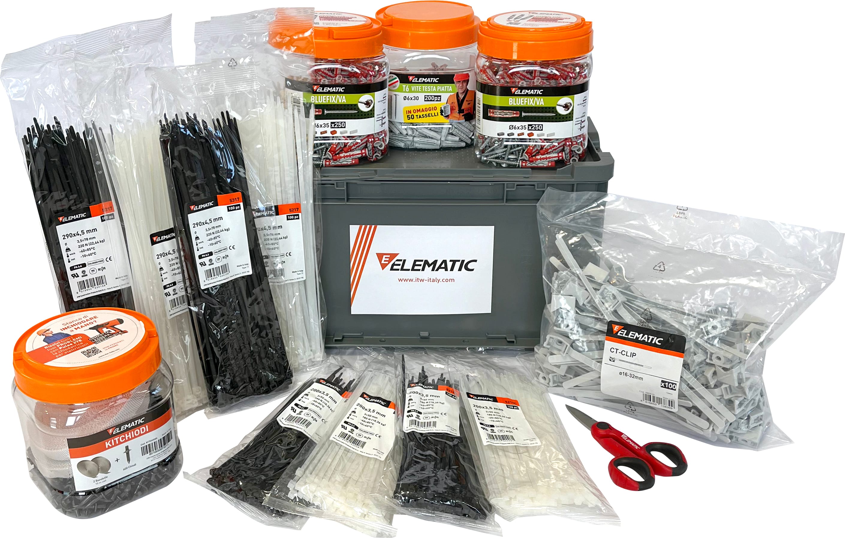 La cassetta degli indispensabili EL05 e un mix di prodotti per il cablaggio Elematic Spit pensati esclusivamente per l'elettricista. All'interno troverai:KITCHIODI KIT 600 CHIODI A PERCUSSIONE + 2 BANDELLE (1 pz)565750 1 BARATTOLO T6/VX vite a testa piatta (200 pz)565542 2 BARATTOLO BLUEFIX/VA 6x35 (500 pz)565510 CT-CLIP 16-32 ELEMATIC (100 pz)5214C FASCETTE ELEMATIC PA6.6 NATURALE 200x3,5 (200 pz)5314C FASCETTE ELEMATIC PA6.6 NERA 200x3,5 (200 pz)5217 FASCETTE ELEMATIC PA6.6 NATURALE 290x4,5 (200 pz)5317 FASCETTE ELEMATIC PA6.6 NERA 290x4,5 (200 pz)8211998 FORBICE PROFESSIONALE RP 3 - IN OMAGGIO (1 pz)