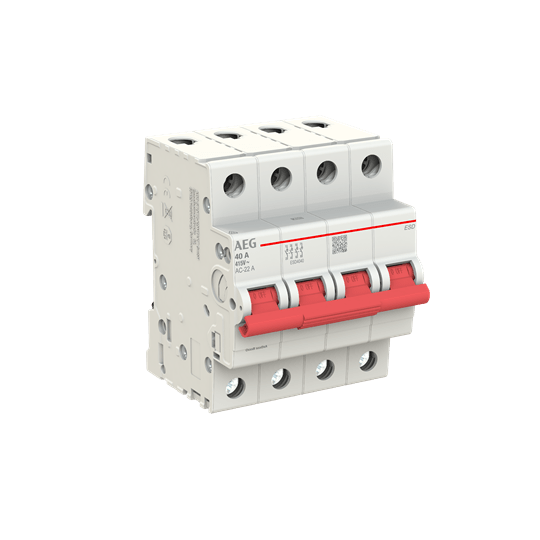 SEZIONATORE MODULARE AEG ESD, 4 POLI 4 MODULI, CORRENTE NOMINALE 40A, POTENZA DISSIPATA 10W, TENSIONE NOMINALE 415VAC, CATEGORIA D'IMPIEGO AC-22A DC-21A, FREQUENZA 50/60Hz, TEMPERATURA D'IMPIEGO -25/+55°C, TEMPERATURA DI STOCCAGGIO -40/+70°C