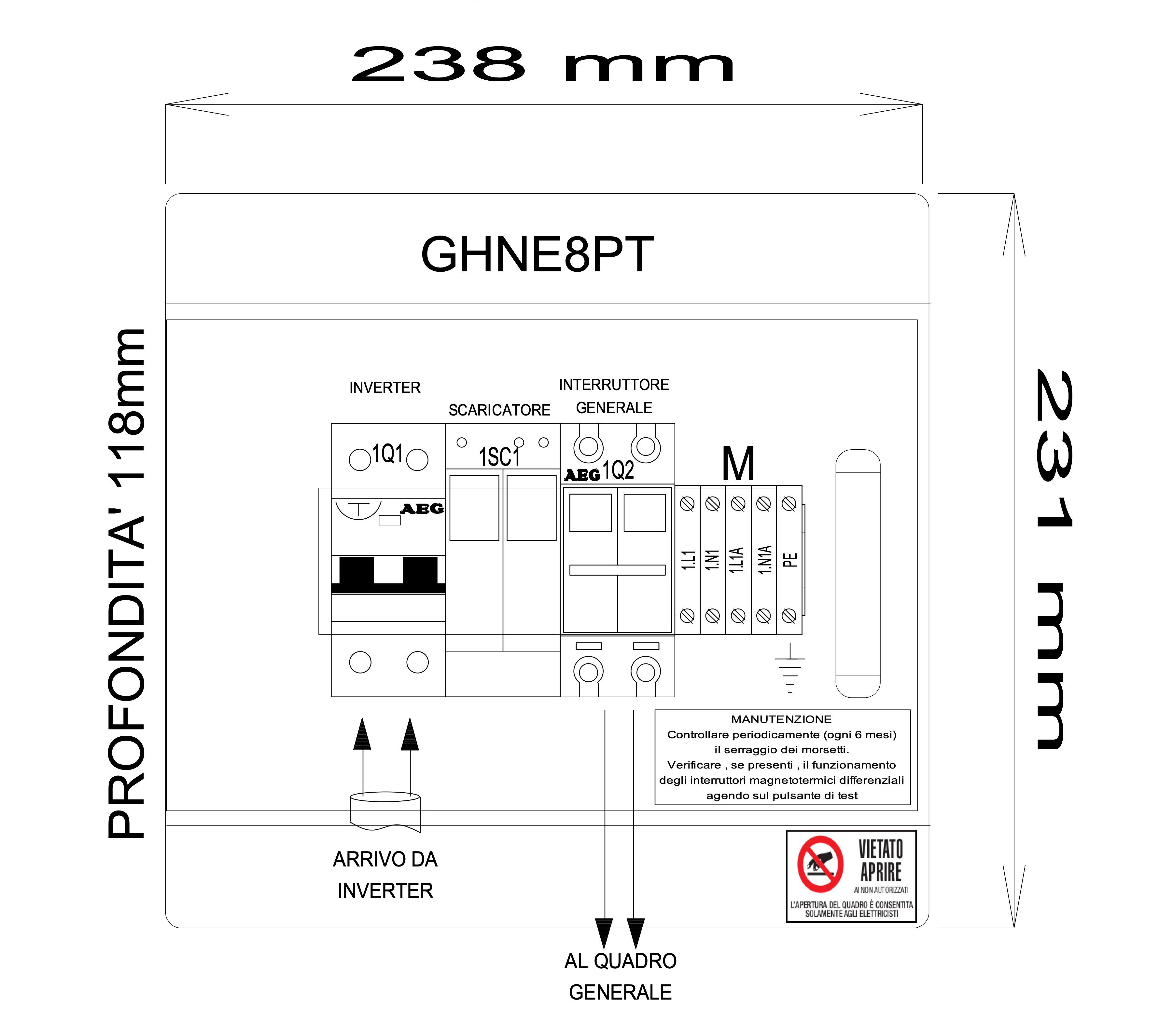 Quadro cablato AC monofase per la protezione dell' inverter e del contatore di produzione. Composto da un interruttore magnetotermico differenziale in curva C da 6kA classe A da 300mA, un interruttore magnetotermico curva C 6kA e da uno scaricatore di sovratensione di Tipo 2. La componentistica è inserita all'interno di un centralino in materiale isolante IP65 a 8 moduli.