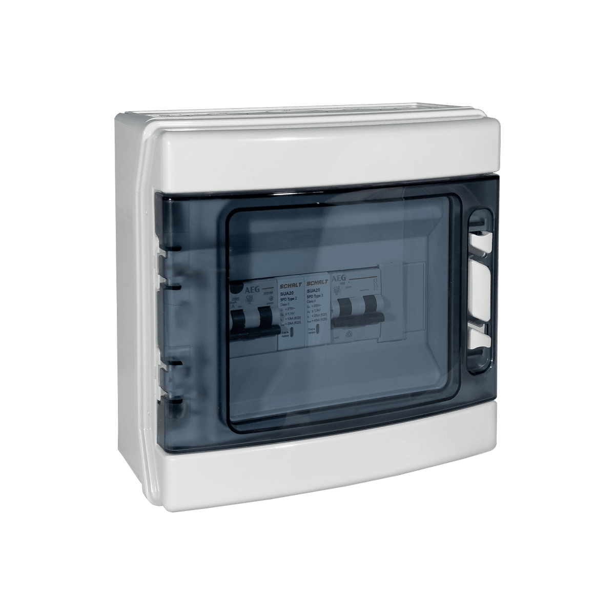Quadro cablato AC monofase per la protezione dell' inverter e del contatore di produzione. Composto da un interruttore magnetotermico differenziale in curva C da 6kA classe A da 300mA, un interruttore magnetotermico curva C 6kA e da uno scaricatore di sovratensione di Tipo 2. La componentistica è inserita all'interno di un centralino in materiale isolante IP65 a 8 moduli.