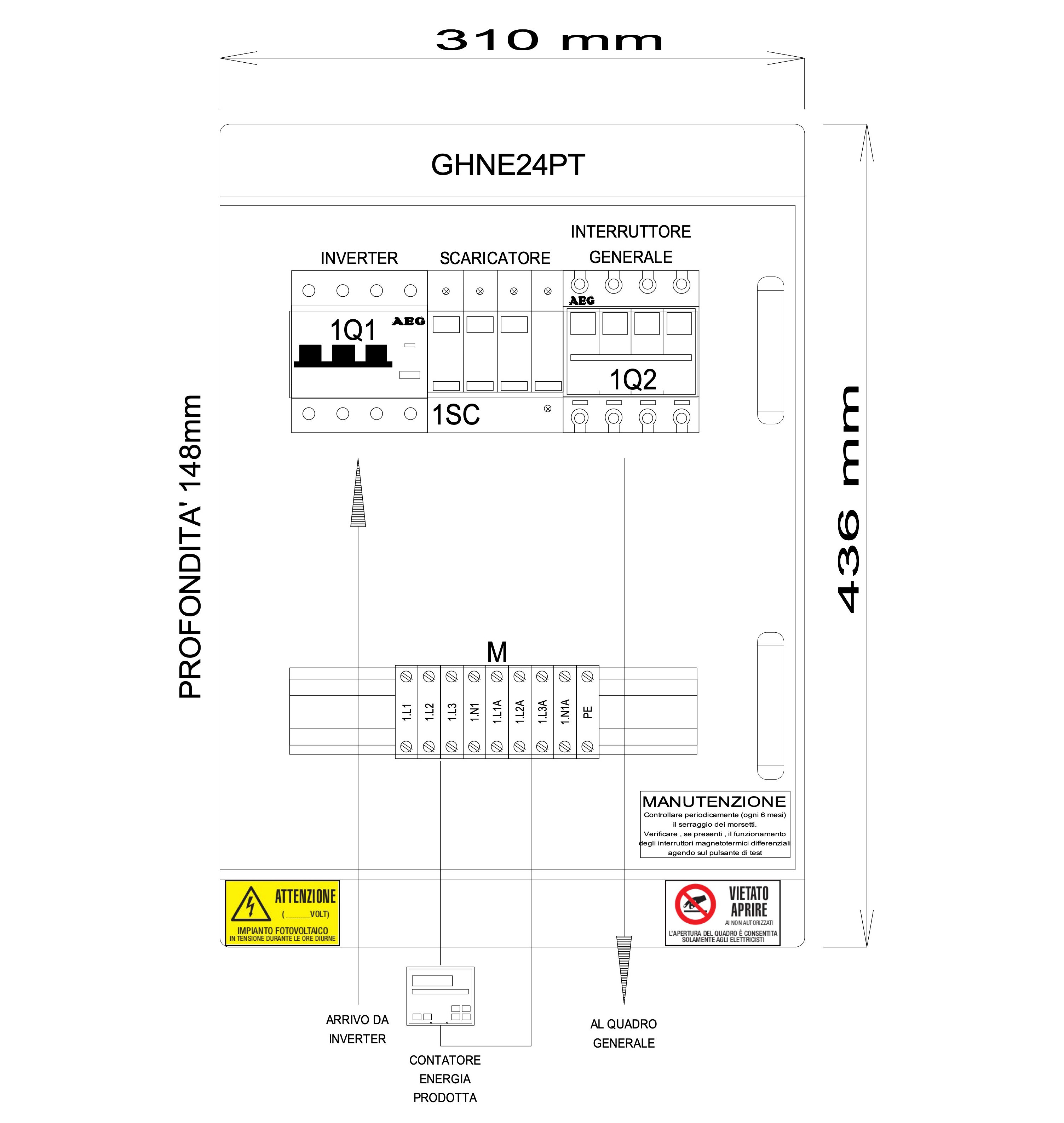 Quadro cablato AC trifase per la protezione dell' inverter e del contatore di produzione. Composto da un interruttore magnetotermico differenziale protezione inverter in curva C 6kA classe A da 300mA, un interruttore magnetotermico 6kA protezione rete e uno scaricatore di sovratensione di Tipo 2. La componentistica è inserita all'interno di un centralino in materiale isolante IP65 a 24 moduli.