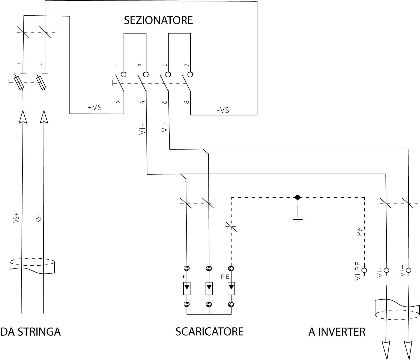 Quadro cablato di protezione stringhe per impianto fotovoltaico. 3 stringhe singole fino a 1000Vdc con protezione fusibile GPV 16A in ingresso, 3 basi portafusibili 10,3x38 1000Vdc, 3 scaricatori di sovratensione tipo 2 a 3 cartucce 1000Vdc Isn 20kA, 3 interruttori non automatico-sezionatore 2x40A, contenitore in ABS con porta trasparente 36 moduli IP65