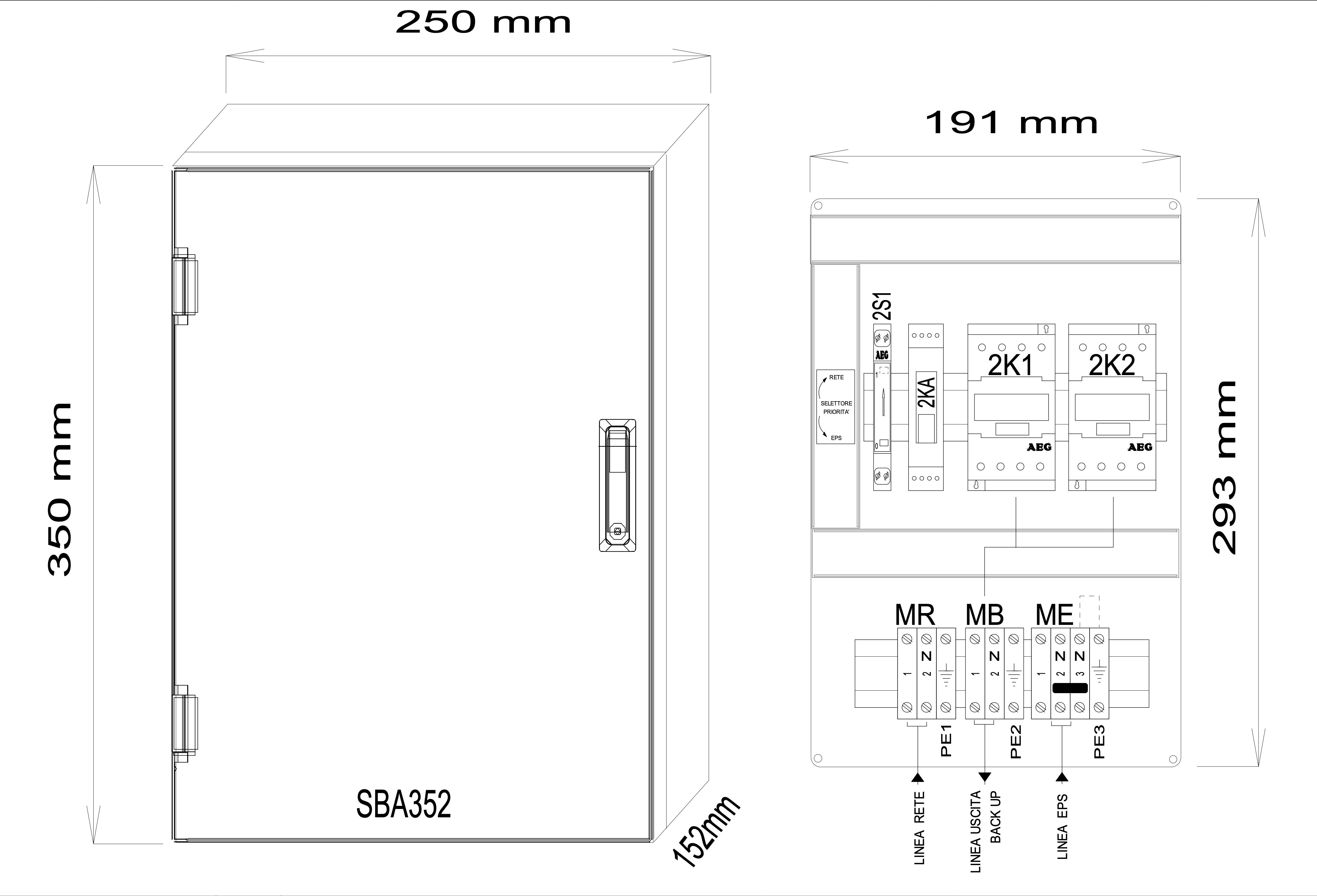 Quadro di backup monofase 230V 30A per la gestione dell'uscita EPS degli inverter fotovoltaici. Tramite questo quadro elettrico è possibile commutare in sicurezza l'alimentazione dei carichi da rete a EPS, con ripristino della rete in automatico. Il quadro è composto da 2 contattori interbloccati in categoria AC3, selettore di priorità RETE o EPS e una predisposizione di collegamento N-PE. Contenitore in ABS con porta cieca.