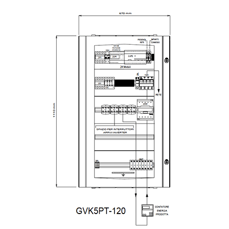I quadri di interfaccia OPEN rappresentano una soluzione per la connessione di impianti fotovoltaici CEI 0-21. I quadri OPEN nascono con lo spazio di cablaggio per gli interruttori di protezione inverter che saranno installabili successivamente tramite icollegamenti già forniti- Interruttore Generale 4x125A 50kA (EN60947-2) con bobina di sgancio per funzione di rincalzo-Relè di interfaccia NA003 con Ups di emergenza (CEI 0-21)-Contattore DDI 4 poli 140A AC-3. Spazio per cablaggio Interruttori protezioneinverter 3F+N: 2x33kW (oppure 40kW+20kW o 50kW+10kW), 3x20kW, 4x15kW, 5x12,5kW-Kit di cablaggio incluso (6x35mm2 nero+2x35mm2 blu; 9x16mm2 nero+3x16mm2 blu)-Interruttori previsti 3F+N (da ordinare a parte):10kW DMA63NPC20/300;12,5kW DMA63NPC25/300;15kW DMA63NPC32/300;20kW E94SC40+HD9532/300; 25kW E94SC50+HD9463/300;33kW E94SC63+HD9463/300;40kW E880504C80+HD94100/300;50kW E880504C100+HD94100/300. I componenti sono racchiusi in un contenitore a parete in metallo IP65 LxHxP 670x110x212mm.