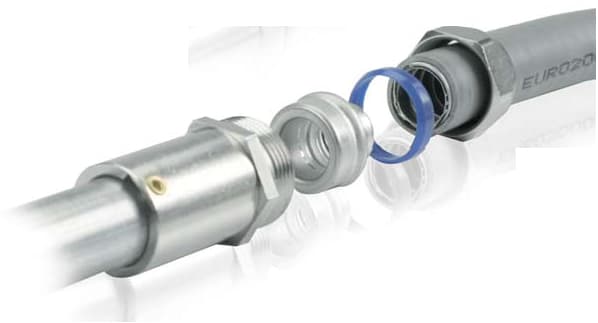 Raccordo ad innesto rapido per il collegamento di un tubo rigido con un tubo flessibile. Garantisce un grado di protezione IP67 a una temperatura di esercizio da -25°C a 150°C. Continuità elettrica rilevata < 0,05 ohm/mt