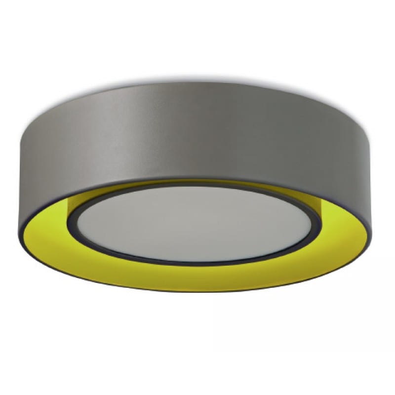 Plafoniera in metallo verniciato in varie combinazioni di colore con sorgente luminosa a LED. Apparecchio fornito con diffusore in metacrilato opalino (PMMA). Versioni dimmerabili disponibili su richiesta. Sorgente Luminosa: LED 25W 3500Lm+11W 900Lm 3000K. Colore externo: bianco lucido. Colore interno: Arancio opaco.