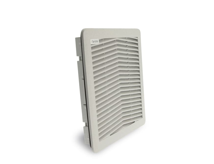 Gruppo filtro "FPF"con flusso d'aria dall'esterno verso l'interno dell'involucro. Grazie al particolare design risponde alle esigenze di compattezza e rapidità di installazione tipiche delle moderne apparecchiature. Caratterizzato da un basso profilo esterno, da un sistema di montaggio a scatto con ganci elastici e da una guarnizione di tenuta premontata che consente di ottenere una protezione alla polvere e all'acqua. Montaggio senza viti in aperture di forma quadrata come da schema di foratura; spessore della lamiera compreso tra 1,5 e 2,2 mm; eventuale fissaggio attraverso viti a testa svasata non fornite. Parti plastiche in PC/ABS, guarnizione di tenuta in schiuma poliuretanica posizionata a macchina. Panno filtro in fibre sintetiche termolegate a struttura progressiva, classe di filtrazione G3 secondo EN 779.