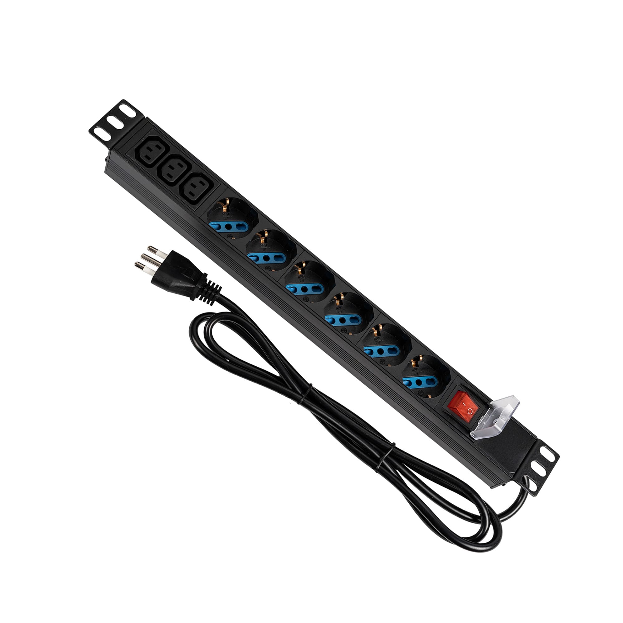 Barra alimentazione orizzontale 1 unità Rack 19"cavo 1,8 m. 3G1,5 H05VV-Fspina italiana 2P+T 16A6 prese bipasso italo/tedesche 2P+T 16A3 prese IEC C13 2P+T 10A+ interruttore bipolare luminoso, colore nero