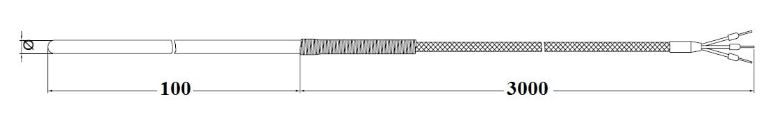 termoresist. materie plastiche: Mod.: TR1 (singolo elemento) modello: senza raccordo elemento + numero fili:Singolo 3 fili classe precisione:Pt100 classe B (1 DIN) Cavo (Standard a norma DIN):TTS (0,35 mm) Materiale guaina: Acciaio Inox Diametro guaina (mm): 5 lunghezza cavo (dm):30 dm tipo di connettore:nessun connettore armatura:nessuna guaina lunghezza immersione Li (mm): 100 mm certificati: nessuno