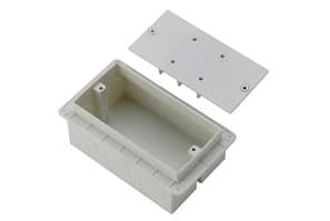 Controcassa da incasso a muro in tecnopolimero completa di coperchio antisfondamento da calcestruzzo. Materiale: polipropilene a iniezione, passacavo a pressione OL20056, Viti inox 3.5 x 16. Incassabile sia in gettate di calcestruzzo che in muri di mattoni. Adatta a ricevere tubi corrugati diam.25mm max