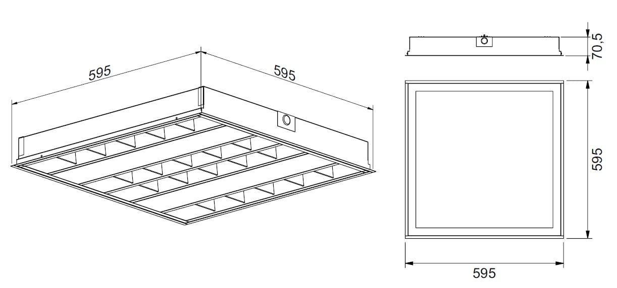 Corpo e telaio in lamiera di acciaio presso piegata, verniciata con polveri epossidiche previa fosfatazione. Alimentazione incorporata CAE elettronica, Ottica Dark a bassa luminanza idonea in ambienti con videoterminale (inferiore a 1000 cd/mq per angolisuperiori a 65° trasversali e longitudinali). Sorgente luminosa LED 48W 6.480Lm 4000K. Colore: Grigio. Emissione diretta. Sistema di fissaggio incasso in appoggio in controsoffitti 600x600 mm con struttura portante a vista senza l’utilizzo di accessori, in controsoffitti in cartongesso tramite l’utilizzo del telaio TLC3.