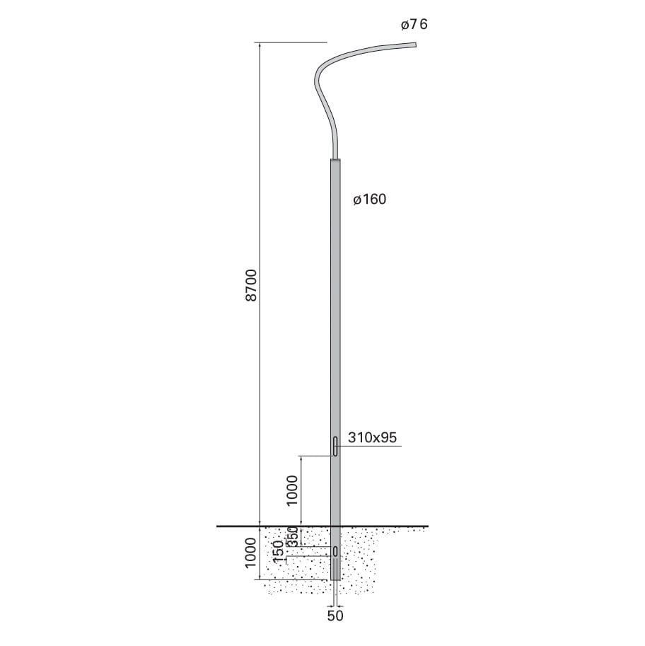 Palo H 8700mm. Palo di geometria cilindrica, realizzato in acciaio zincato a caldo 70 micron come da normativa UNI EN ISO 1461 (EN 40-5), sottoposto a trattamento di verniciatura a polvere texturizzata RAL 9005.Il palo è costituito da un unico tubo metallico; è in acciaio EN10025-S235JR, ha diametro 160 mm, spessore 3 mm e altezza 8700 mm f.t. L'asola per la portella è dimensiona a 310x95 mm, ad altezza 1000 mm dal terreno, idonea per il montaggio della morsettiera a due fusibili (cod. 1863). Il palo permette l'istallazione di morsettiere italiane (grado di protezione IP44 IK08), francesi, spagnole (solo piccole), inglesi (con adattatore in legno marino cod. B944 da ordinare separatamente) e tedesche/svizzere (tramite guida DIN cod. B943 da ordinare separatamente).Portella a filo, realizzata in fusione di alluminio, con relativa chiave per la portella (cod. 0246); la chiusura è assicurata tramite una guarnizione di tenuta che si adatta alle irregolarità superficiali del palo. Il palo è completo di braccio singolo di lunghezza 1400 mm. Braccio realizzato in acciaio S235JR ø76mm spessore 4mm. Nella parte superiore del palo è saldata una piastra metallica realizzata in acciaio zincato, munita di 4 fori filettati, adibita al fissaggio dei bracci per mezzo diviti M10 UNI 5931 in acciaio inox AISI 304.