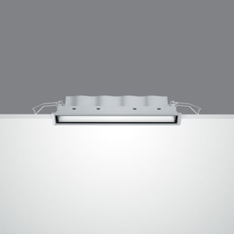 Apparecchio miniaturizzato rettangolare ad incasso con sorgenti LED. Corpo principale con superficie radiante in alluminio pressofuso, versione con cornice perimetrale di battuta. Sistema ottico asimmetrico specializzato per ottenere una efficace distribuzione wall washer. Recuperatore di flusso - riflettore in alluminio superpuro - schermo in PMMA con texture millerighe; una speciale pellicola in materiale acrilico, abbinata allo schermo, permette di ottenere un’emissione uniforme ed efficace sulla parete. Telaio perimetrale interno in policarbonato nero. Fornito con gruppo di alimentazione dimmerabile DALI collegato all’apparecchio. LED bianco warm - lifetime con flusso residuo 80% (L80): 50.000 ore - Ta 25°.