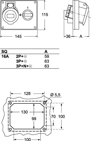 Prese con interruttore di blocco senza portafusibili da quadro. • Conformi alle norme CEI EN 60309-1, -2 e -4 • Custodie e frutti in materiale isolante termoplastico autoestinguente grigio RAL 7035 • Presa con coperchietto a molla • Manopola di comando interruttore lucchettabile • Blocco meccanico che impedisce: la chiusura dell'interruttore a spina estratta, l'estrazione della spina ad interruttore chiuso, lo smontaggio della presa dal quadro o dalla cassetta a spina inserita • Resistenza meccanica agliurti: 6 J • Numero di poli: 3+T
