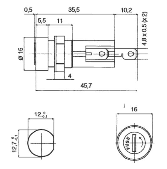 In materiale termoplastico autoestinguente, per montaggio a pannello. Sono forniti senza fusibile. Portafusibili da pannello per fusibili 5X20. Montaggio: da incasso. Corpo: in materiale termoplastico UL 94 V0. Contatti: ottone nichelato. Esec. tappo: a baionetta. Esec. colleg.: attacchi Faston. Dimensioni fusibile: 5x20 mm.