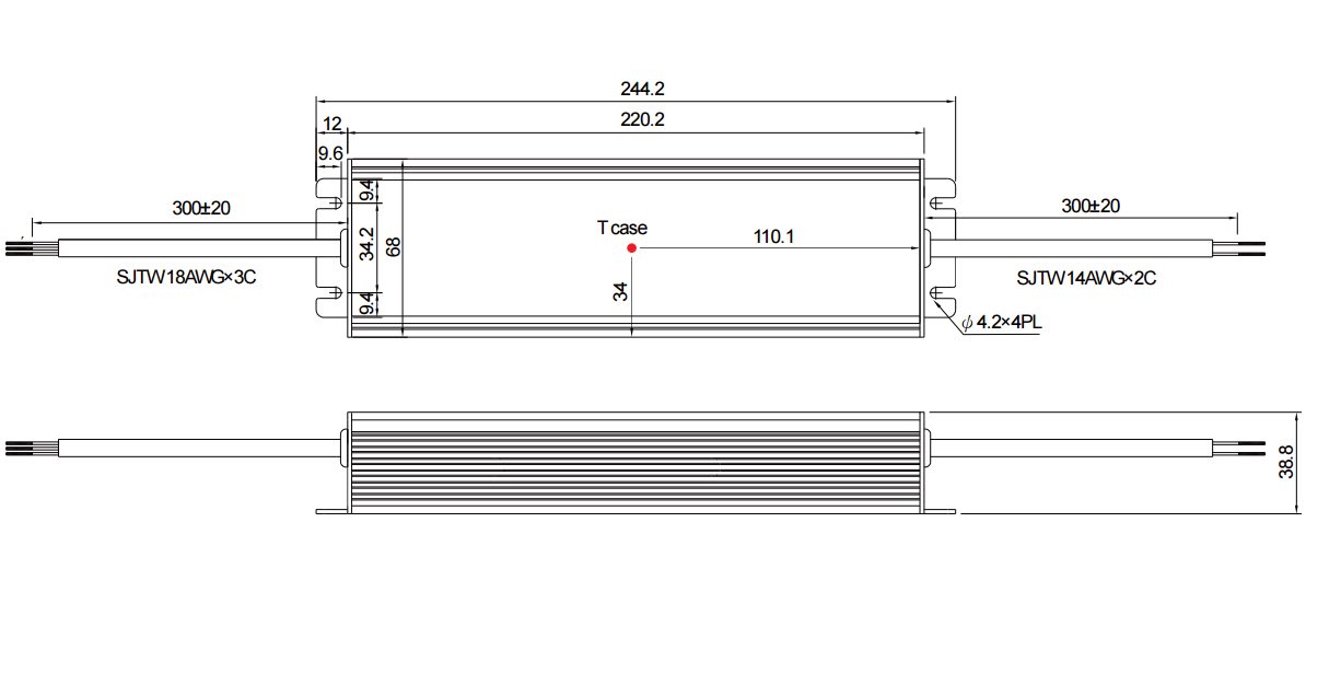 Alimentatore LED 90—305V 47—63Hz 127—431Vdc 240W 48VDC. Dimensioni: 245x68x39 mm. IP67.