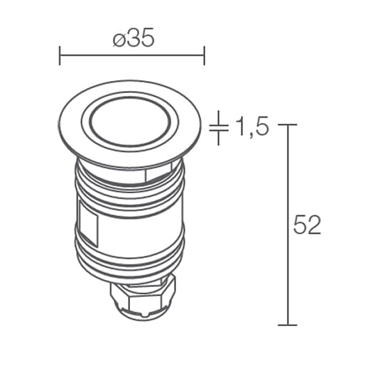 Apparecchio a incasso (parete, pavimento) uplight da esterno e immersione - 1 power LED, max 2W max 500mA - ø35 mm, profondità massima 10 m; corpo e ghiera in acciaio inox AISI 316 L, schermo in vetro temprato; incluso cavo in neoprene di 5 m H05RN-F 2x0,35/0,75 Ø6,3 mm; collegamento in serie; (2700K, 500mA); ottiche: 40°; grado di protezione: IP68; grado di resistenza: IK10; dotato di sistema IPS; temperatura di esercizio: -10°C +45°C; temperatura schermo: max 40°C (Ta 25°C); Glow Wire Test: 960°; sicurezza fotobiologica: gruppo rischio 1 secondo EN62471:2006; classe di isolamento III; peso 0,35 kg; dimensioni ø35x52 mm; foro d'incasso: 30 mm; volume tecnico per dissipazione: ø35x55 mm; dimmerazione disponibile mediante alimentatore dimmerabile; accessori: cassaforma WC5003