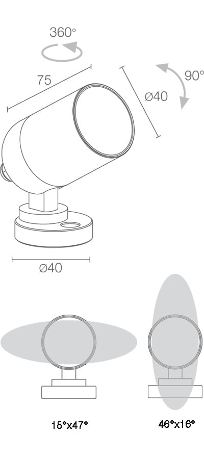 proiettore da esterno; su superficie (soffitto, parete, pavimento, picchetto). 3,5W. 3000 K. 5°. Alluminio.