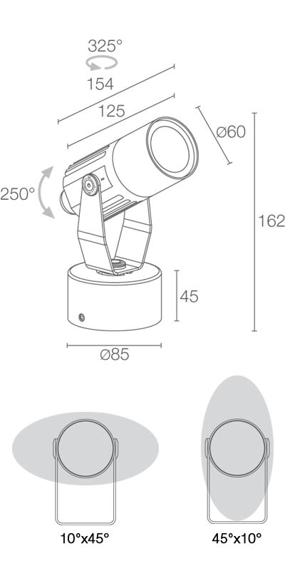 Proiettore da interno ed esterno; su superficie (soffitto, parete, pavimento, picchetto); corpo in alluminio anticorodal lega 6082, schermo in vetro extrachiaro trasparente temprato serigrafato. 7W. 4000 K. 45°. Colore grigio