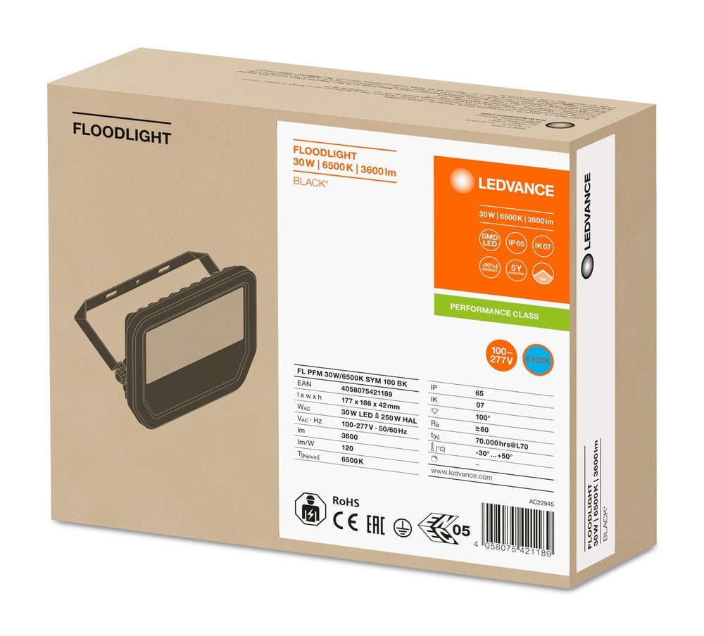 LEDVANCE - LDVFLOOD30865BG3 FL PFM 30W/6500K SYM 100 BK LEDV - FLOOD30865BG3