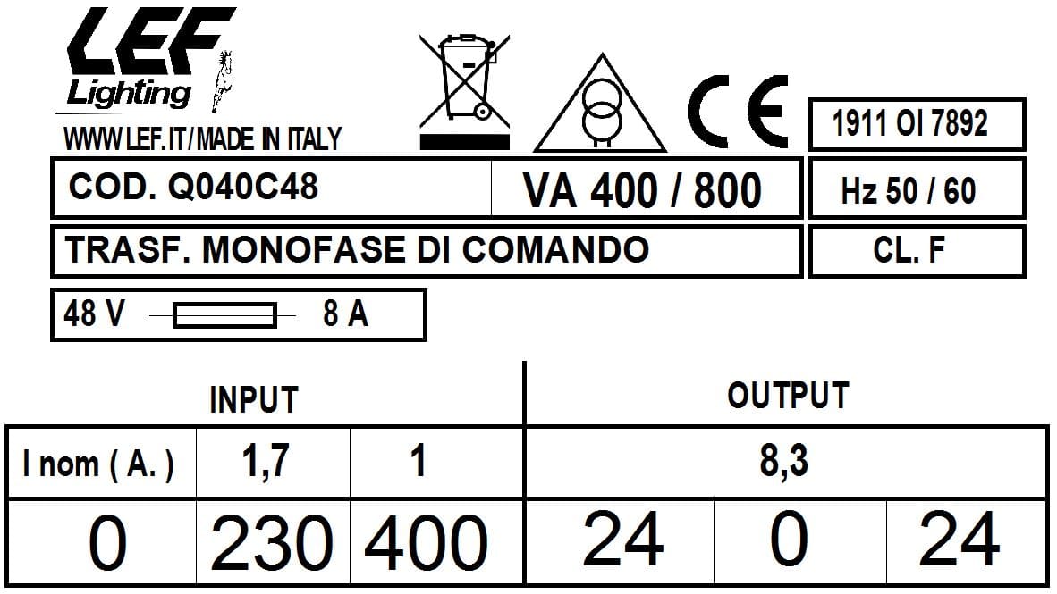 LEF LIGHTING SRL - LEFQ040C48 T.M. 400VA 230.400V / 24.0.24V - Q040C48