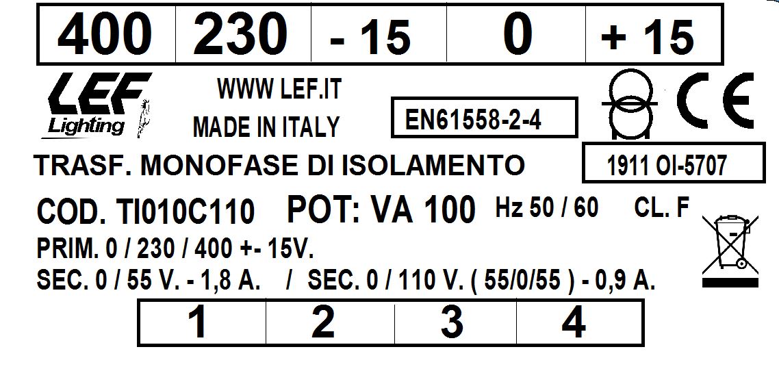 LEF LIGHTING SRL - LEFTI010C110 T.M. 100VA 230.400V / 55 110V - TI010C110