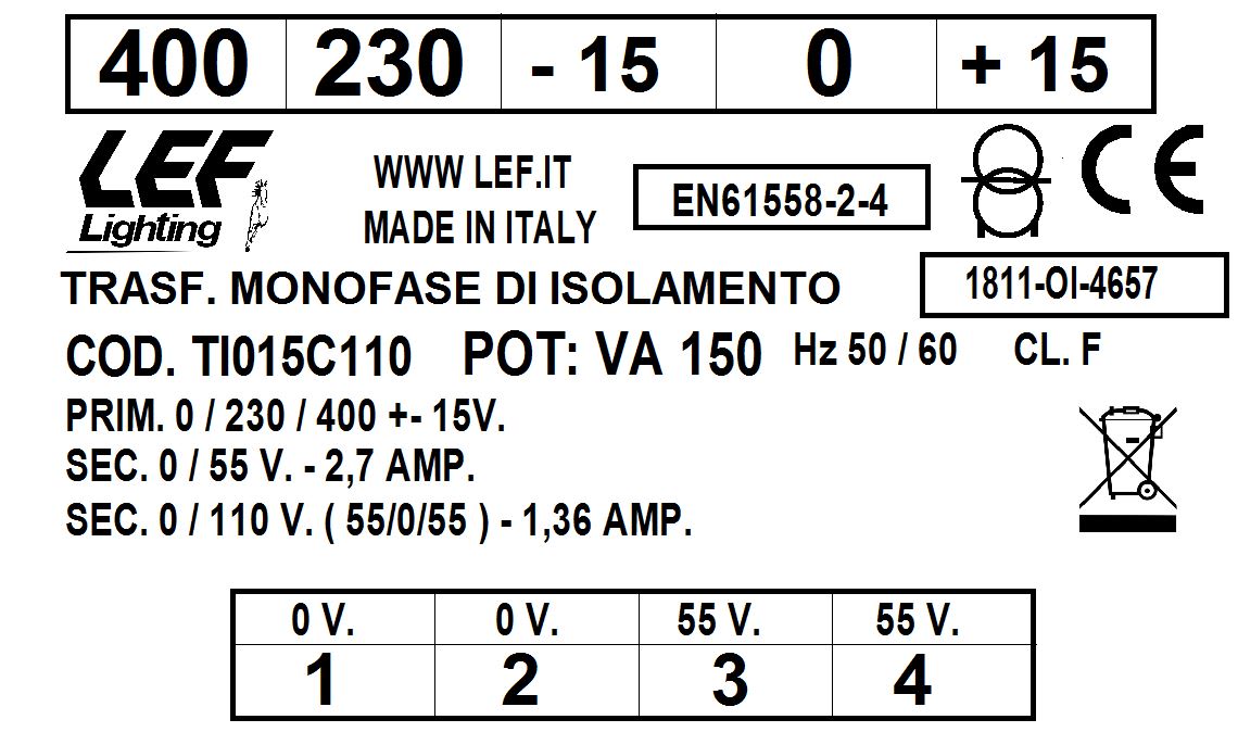LEF LIGHTING SRL - LEFTI015C110 T.M. 150VA 230.400V / 55 110V - TI015C110