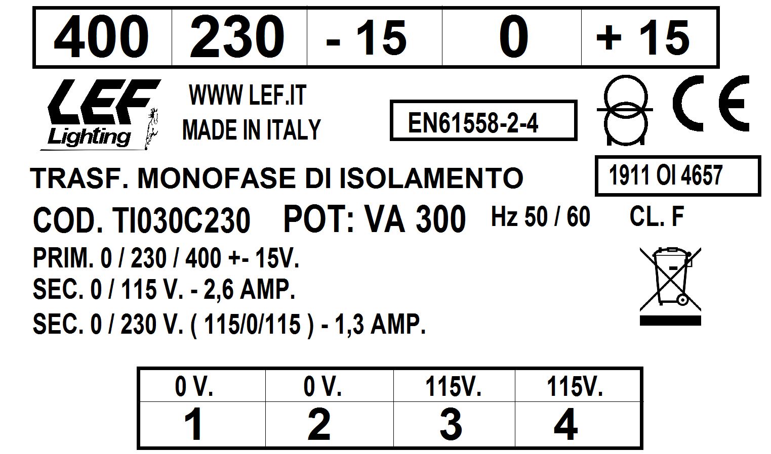 LEF LIGHTING SRL - LEFTI030C230 T.M. 300VA 230.400V / 115 230V - TI030C230