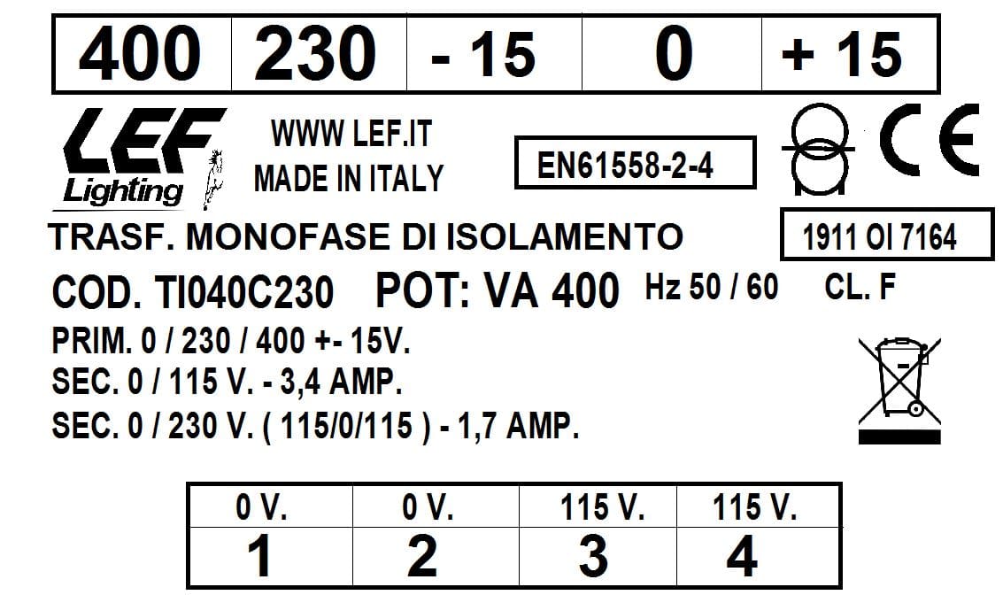 LEF LIGHTING SRL - LEFTI040C230 T.M. 400VA 230.400V / 115 230V - TI040C230