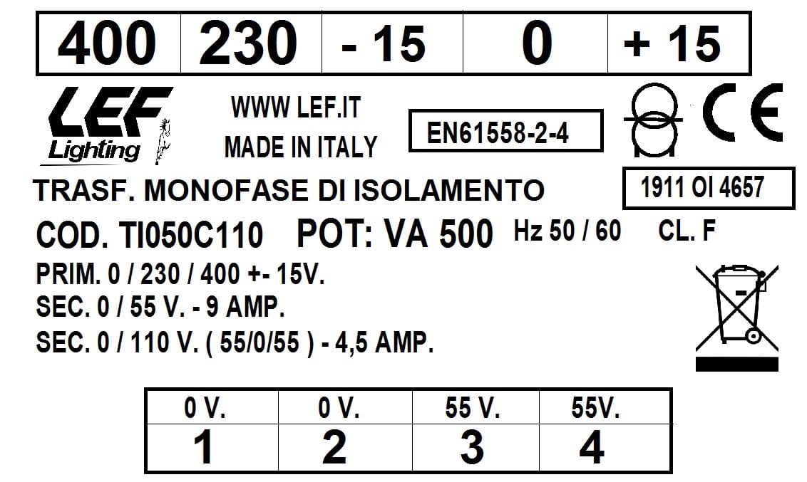 LEF LIGHTING SRL - LEFTI050C110 T.M. 500VA 230.400V / 55 110V - TI050C110
