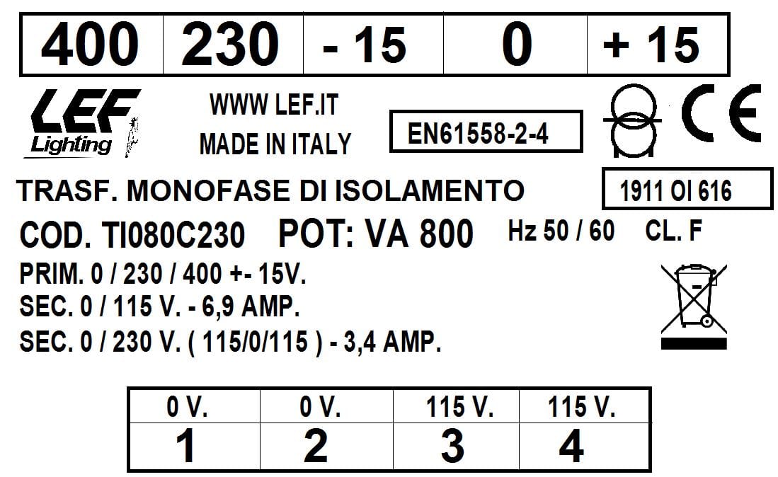 LEF LIGHTING SRL - LEFTI080C230 T.M. 800VA 230.400V / 115 230V - TI080C230