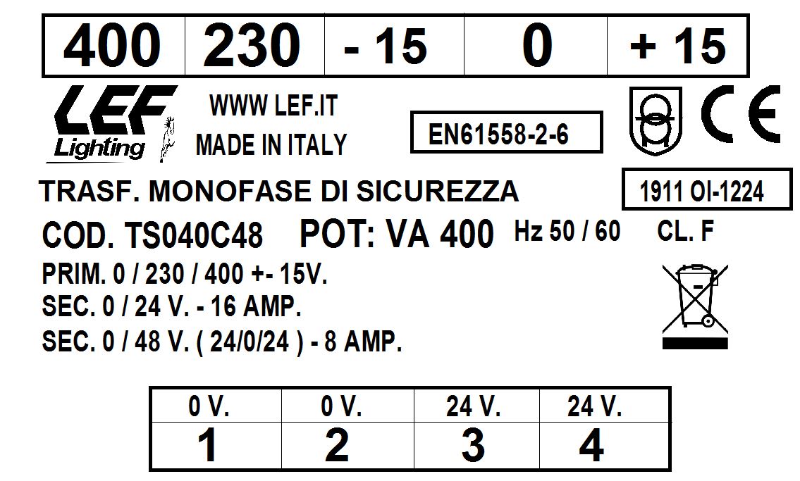 LEF LIGHTING SRL - LEFTS040C48 T.M. 400VA 230.400V / 24 48V - TS040C48