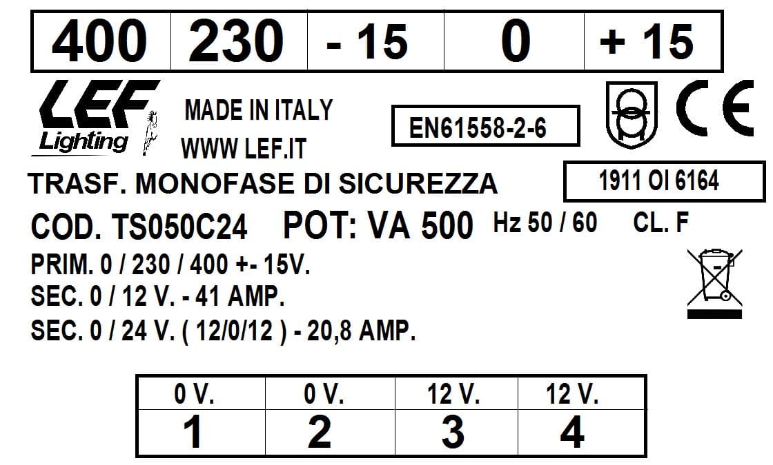 LEF LIGHTING SRL - LEFTS050C24 T.M. 500VA 230.400V / 12 24V - TS050C24