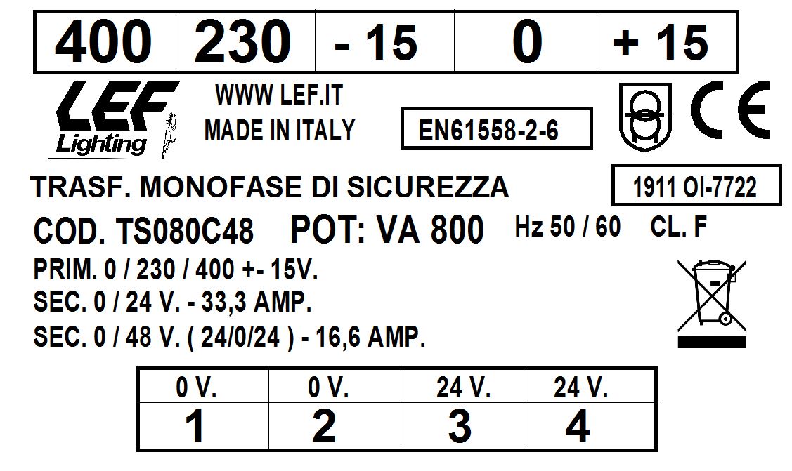LEF LIGHTING SRL - LEFTS080C48 T.M. 800VA 230.400V / 24 48V - TS080C48