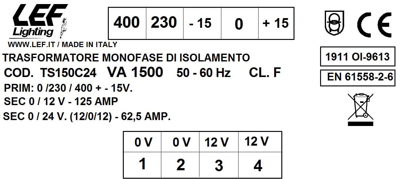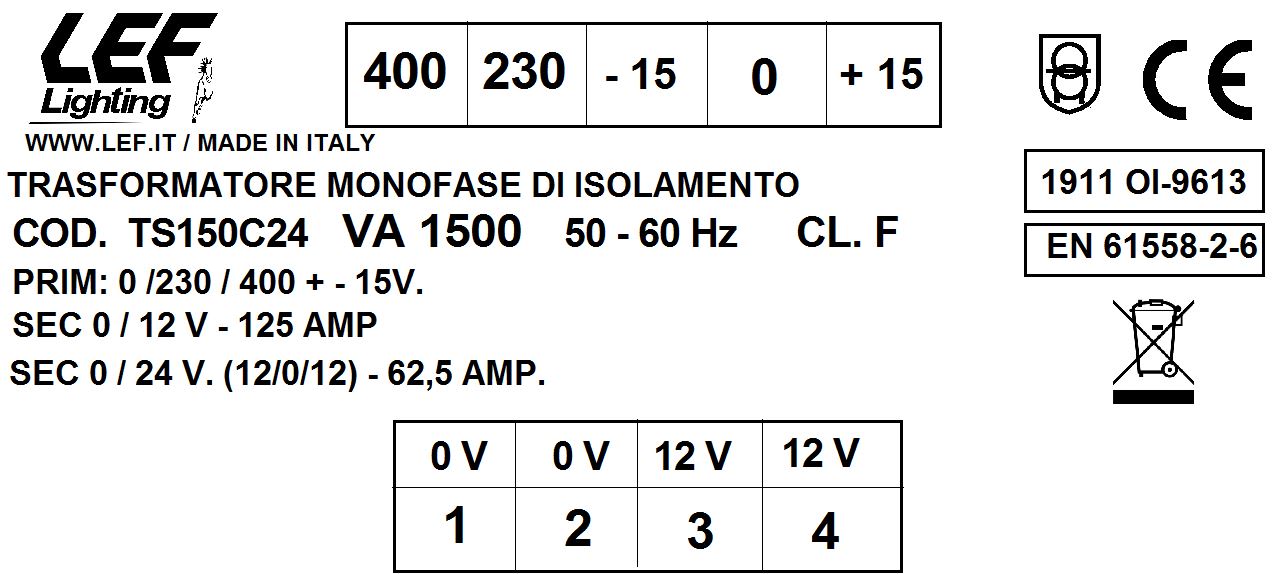 LEF LIGHTING SRL - LEFTS150C24 T.M. 1500VA 230.400V / 12 24V - TS150C24