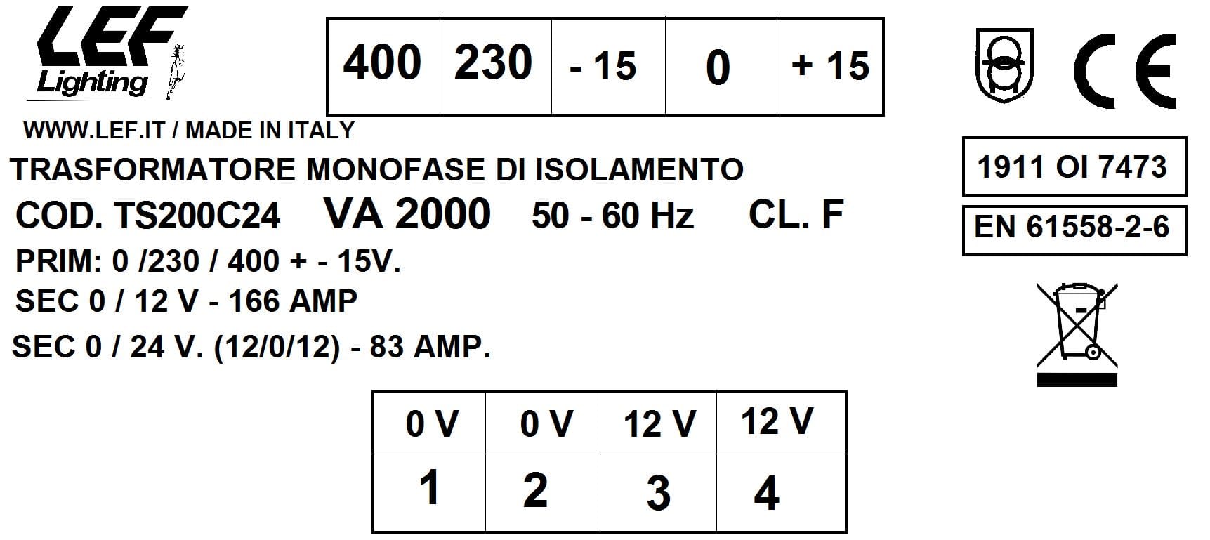 LEF LIGHTING SRL - LEFTS200C24 T.M. 2000VA 230.400V / 12 24V - TS200C24